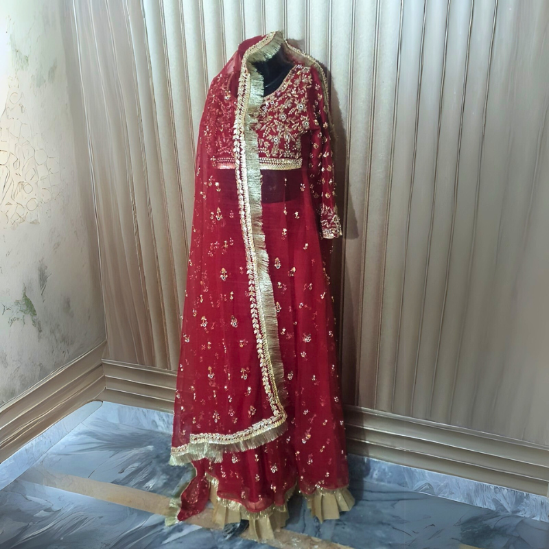 The golden pleated hem and statement border add volume and elegance, while the fully embroidered dupatta with gold fringes completes the ensemble with a regal finish. This outfit is an ideal choice for bridal functions, wedding guests, or traditional parties.