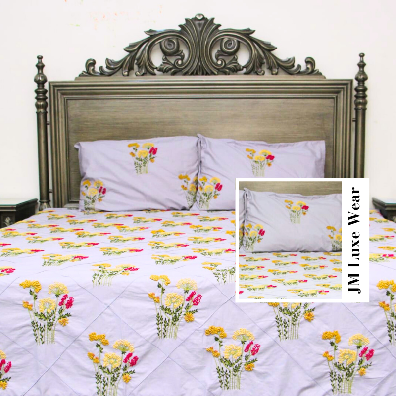 Bring a refreshing burst of color to your bedroom with our Floral Embroidered Cotton Bed Sheet – Lilac Bloom Edition by JM Luxe Wear. Crafted from premium cotton, this bedsheet features a soothing lilac base with vibrant floral embroidery that instantly uplifts the look of your room.
