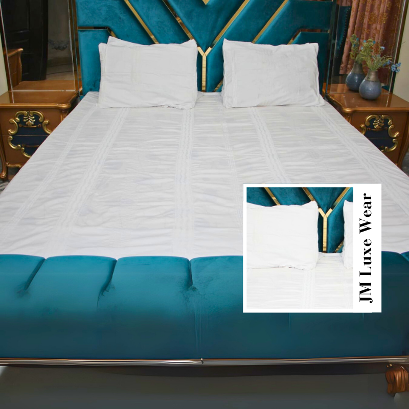 Upgrade your bedroom with our Luxury White Cotton Bed Sheet Set from JM Luxe Wear. Made from high-quality cotton, this bedsheet offers unmatched softness and comfort, ensuring a restful night’s sleep.