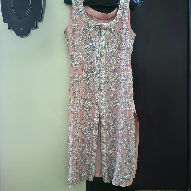 Step into elegance with this beautifully handcrafted Rose Gold Sleeveless Party Kurti, designed for the modern woman who appreciates fine detail. Made from high-quality net and satin inner lining, the kurti is adorned with heavy hand embroidery using beads, sequins, pearls, and fine threadwork that sparkle with every move.